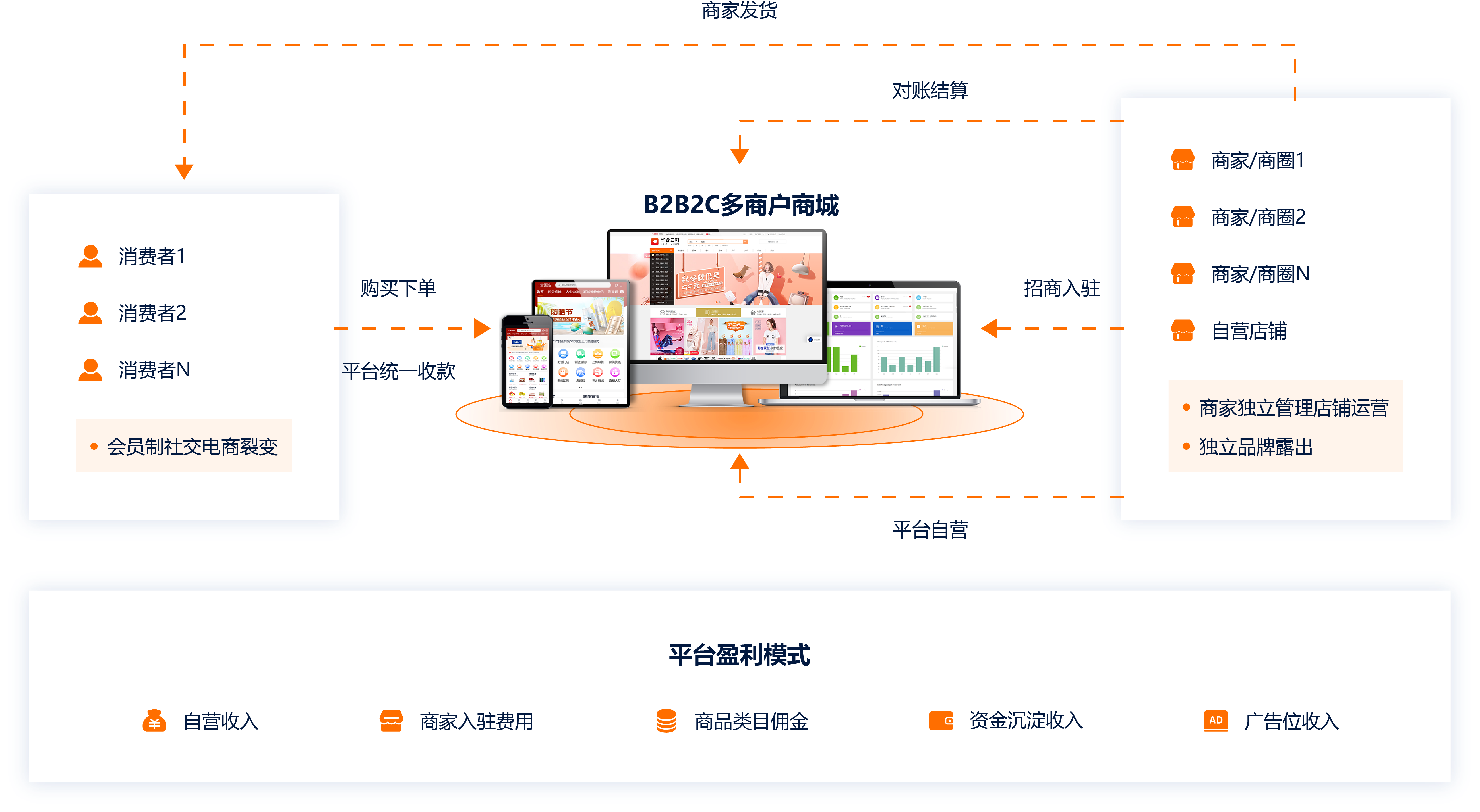 支持企业自营模式,联营模式,招商模式,O2O门店模式,满足企业各个发展阶段的商业模式