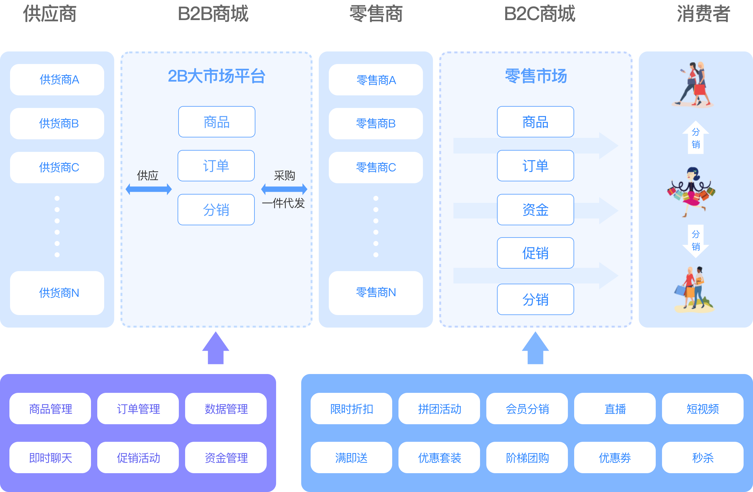 供应商入驻后,发布商品在批发市场板块展示,商家如自己没货,可到批发市场向供应商申请分销,帮供应商一起卖产品,由供应商一