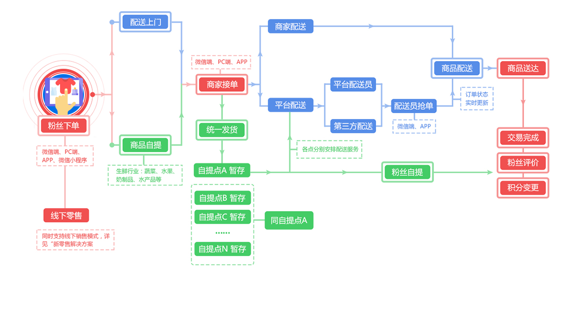 • 完善的配送体系,适应不同行业的运营特点。支持平台配送、商家配送、粉丝自提以及第三方配送平台,并支持多种配送模式组合搭配。