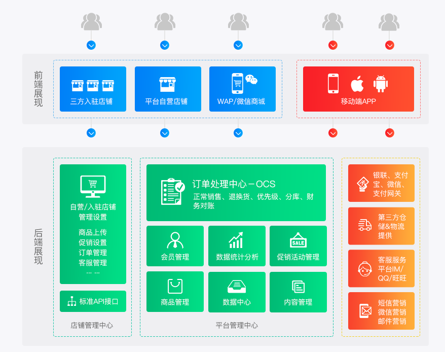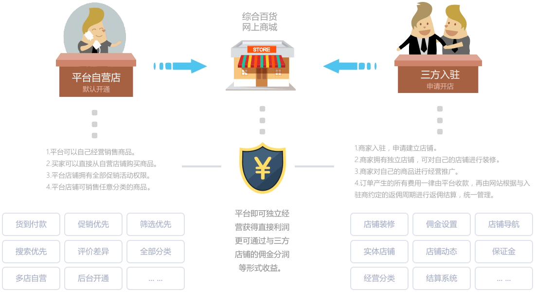 针对综合型百货/购物广场,结合多商家用的平台业务,在实现商家及顾客的数据掌控,和提高线上纯正联动业务经营等需求的电商平台过程中,